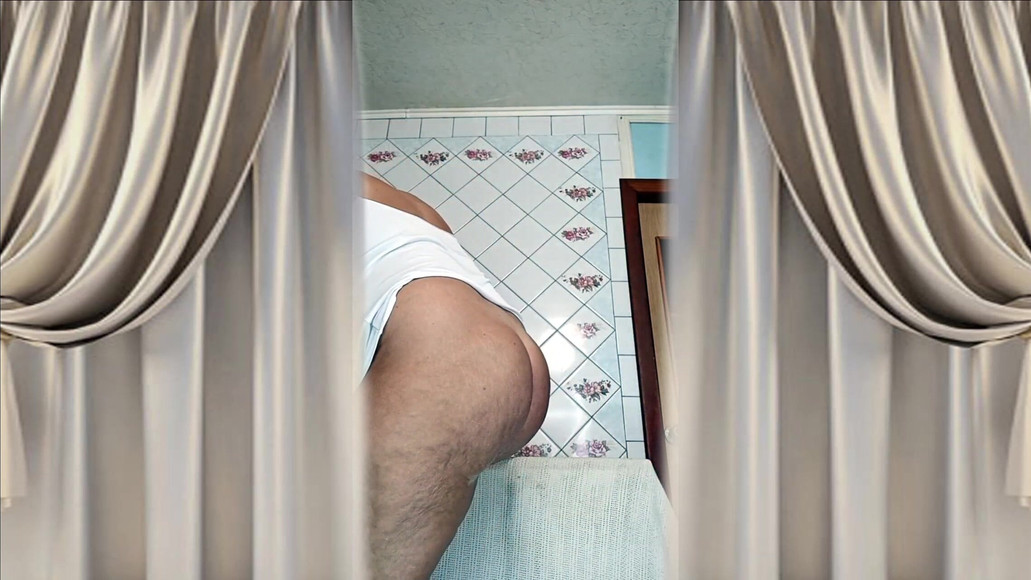 A cheerful older woman changes her look, removing her tiny black panties, which shamelessly cut into her hairy pussy, and puts on tight lace shorts over her luscious butt, revealing her large, plump belly with a deep navel. The playful flirtation continues while sitting on a washing machine. The woman displays her luscious bare feet while sitting on the machine, seductively rubbing her legs together. Spreading her long, slender legs wide, she shakes her large, natural breasts.
