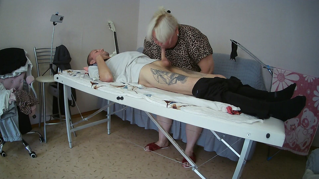 Mother-in-law sucks and jerks off my dick on the massage table and swallows cum