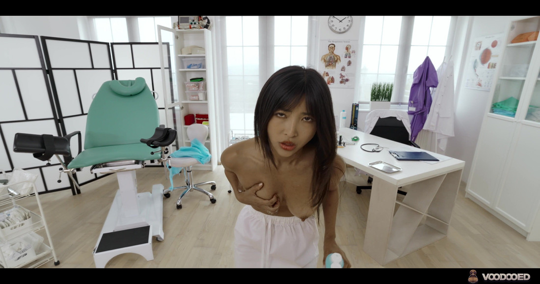 In the doctor’s office, Sam Bourne notices a sexy nurse Emiri Momota bent over as she organizes equipment. He takes a seat and picks up a voodoo doll nearby, showing it to her. With a confused look, she resumes her tasks, but Sam begins experimenting with the doll’s arm. Suddenly, the Nurse’s arm jerks, knocking all her supplies to the floor. Curious, Sam starts to control the doll further, causing Emiri’s arms to move on their own. Helpless, she unbuttons her shirt and removes her bra, her hands caressing her own soft breasts as she moans and starts to get wet. Sam makes her grab a bottle of lubricant exposing his evil intensions. He makes her rub the lube all over her beautiful body. Following his commands, Emiri removes the rest of her clothing, turns around, and spanks herself repeatedly. Her movements become increasingly sensual as Sam makes her finger her wet pussy, her body shuddering with pleasure and asking for more. Overwhelmed, she collapses to her knees, rolling her eyes ba